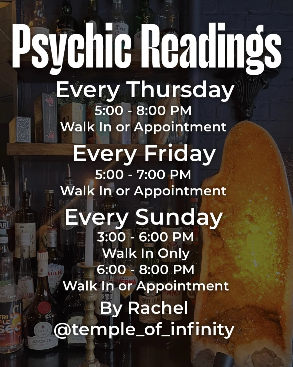 This is a totally unique and custom experience unlike any other bar or metaphysical shop. From love, to protection, luck to abundance, and everything in between. We provide you the tools and information to create a powerful spell and manifest your personal desires.