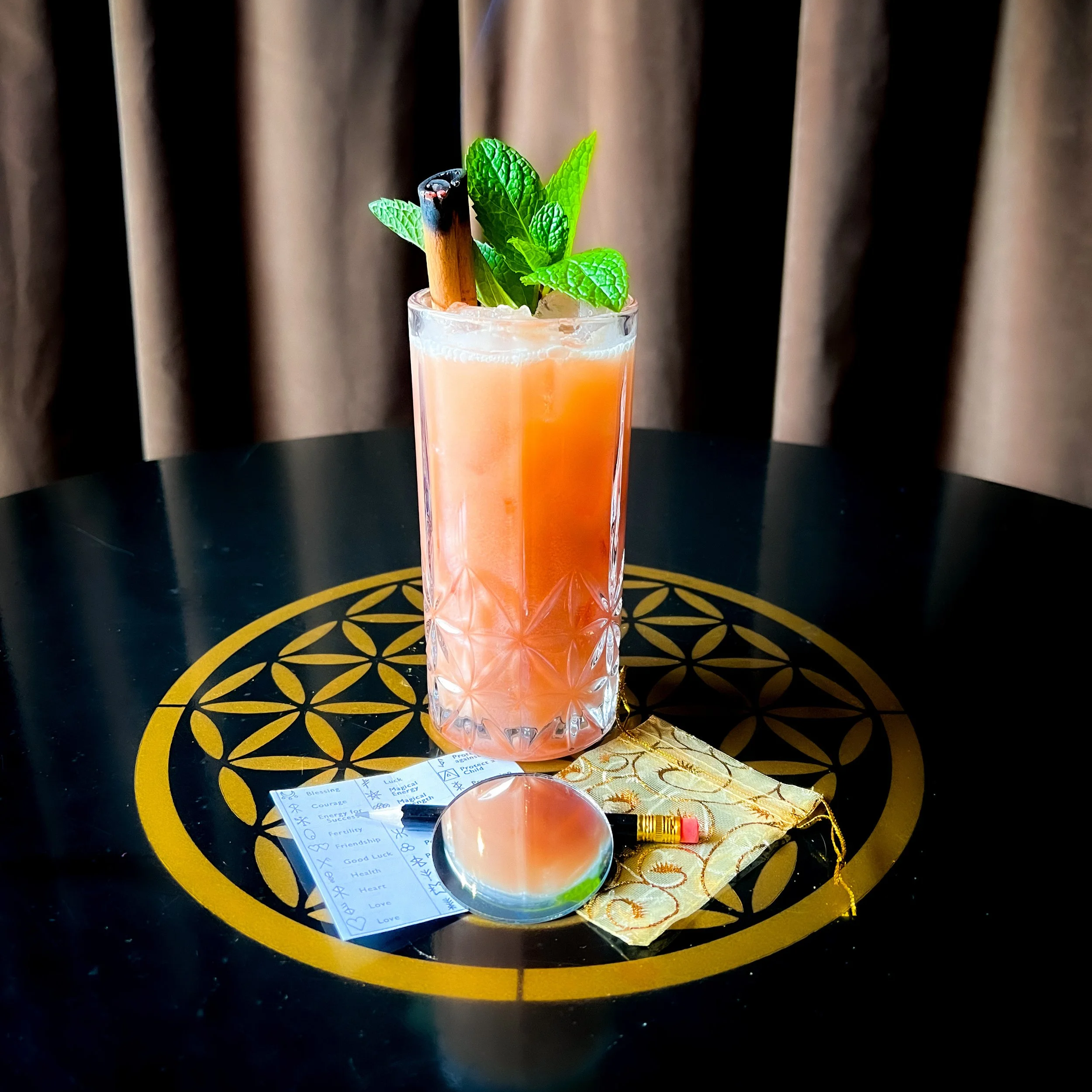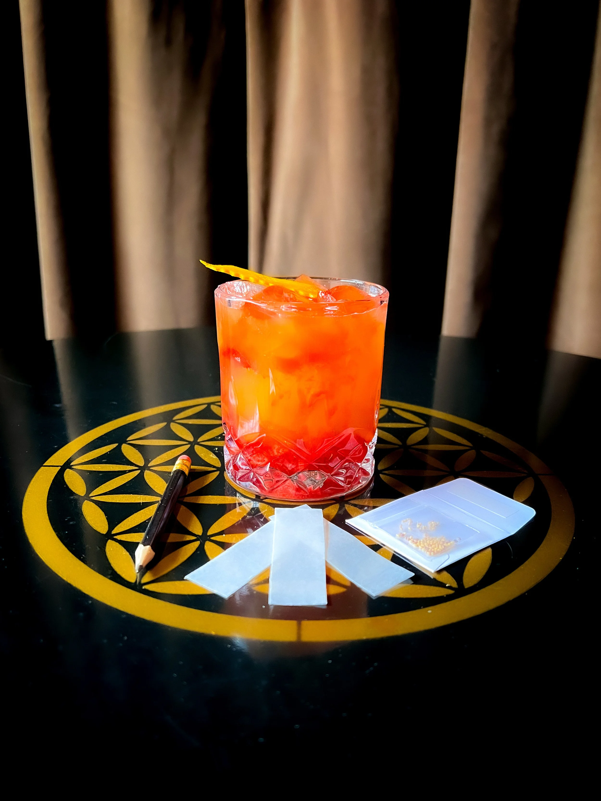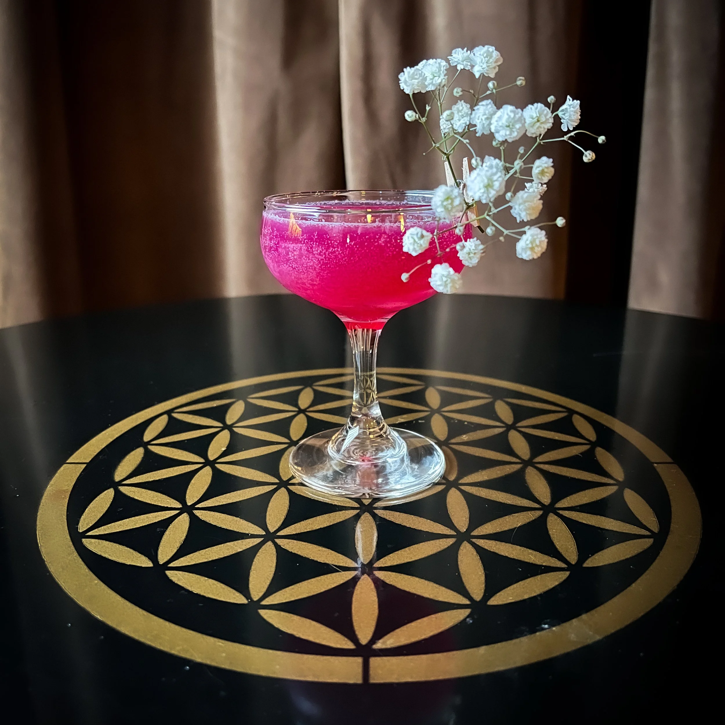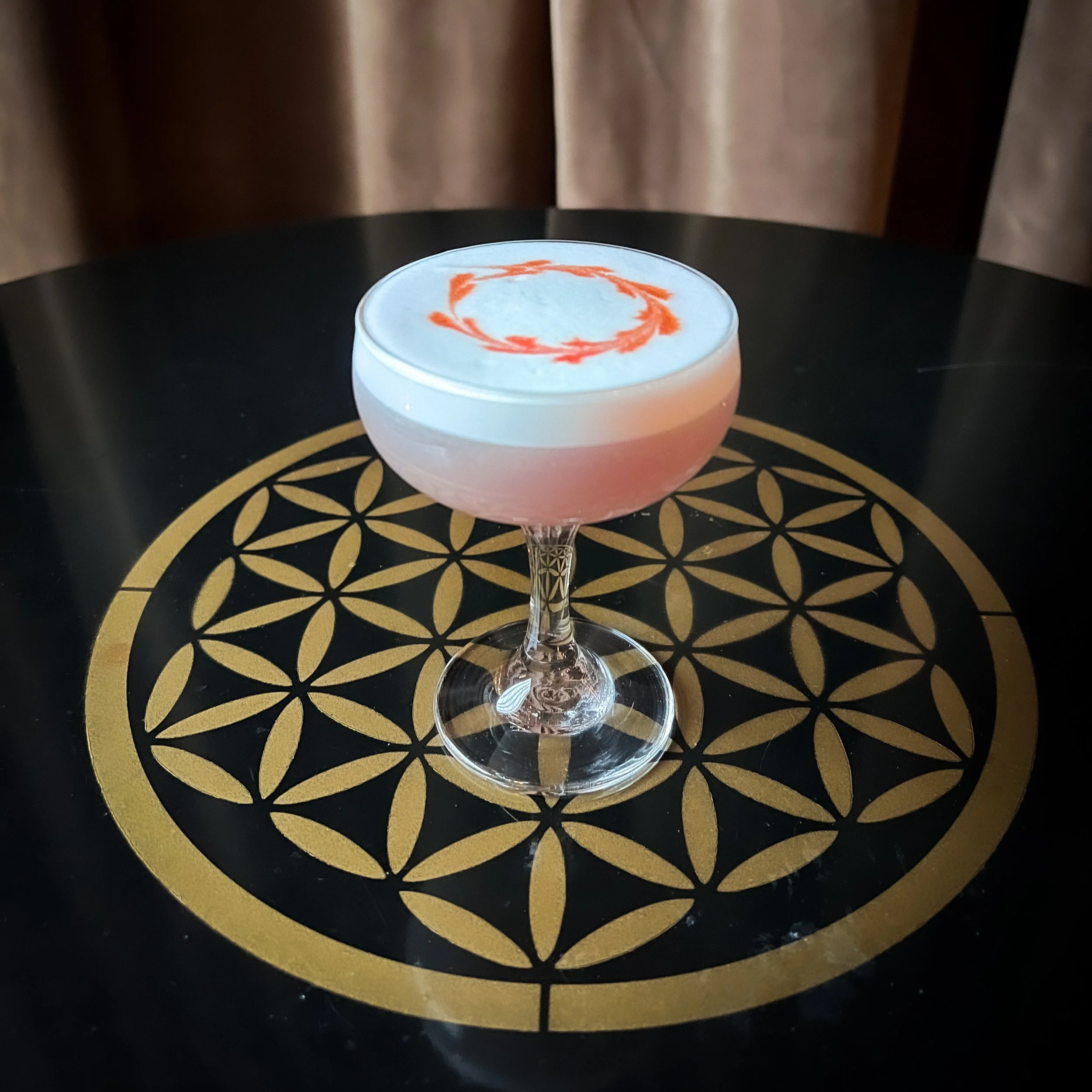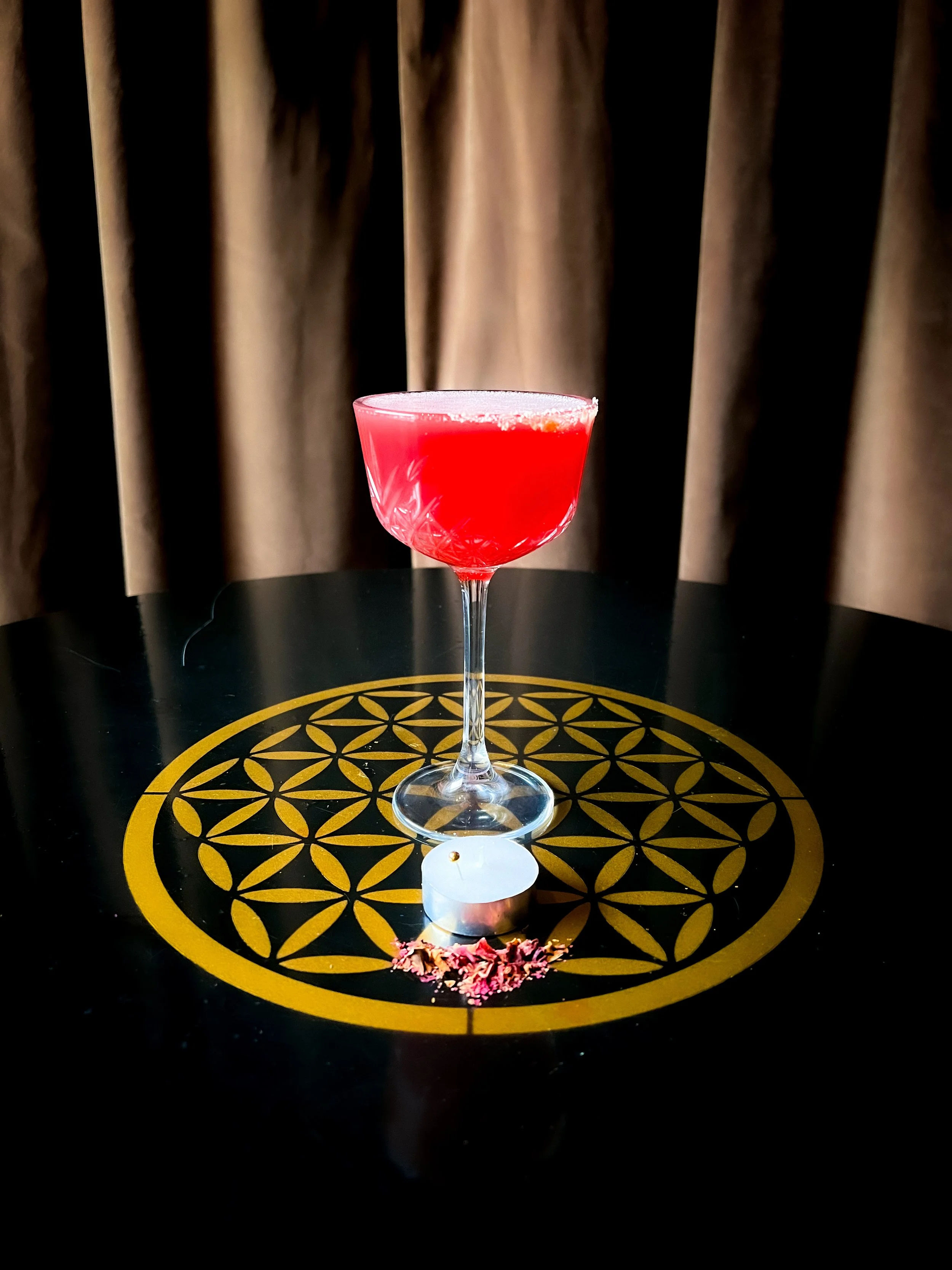 Citadelle gin, elderflower liqueur, orange, aronia berry, rose hips berry, raspberry, hibiscus, hawthorn berry, strawberry, raspberry leaf, rose water, strawberry dusted honey crystals
