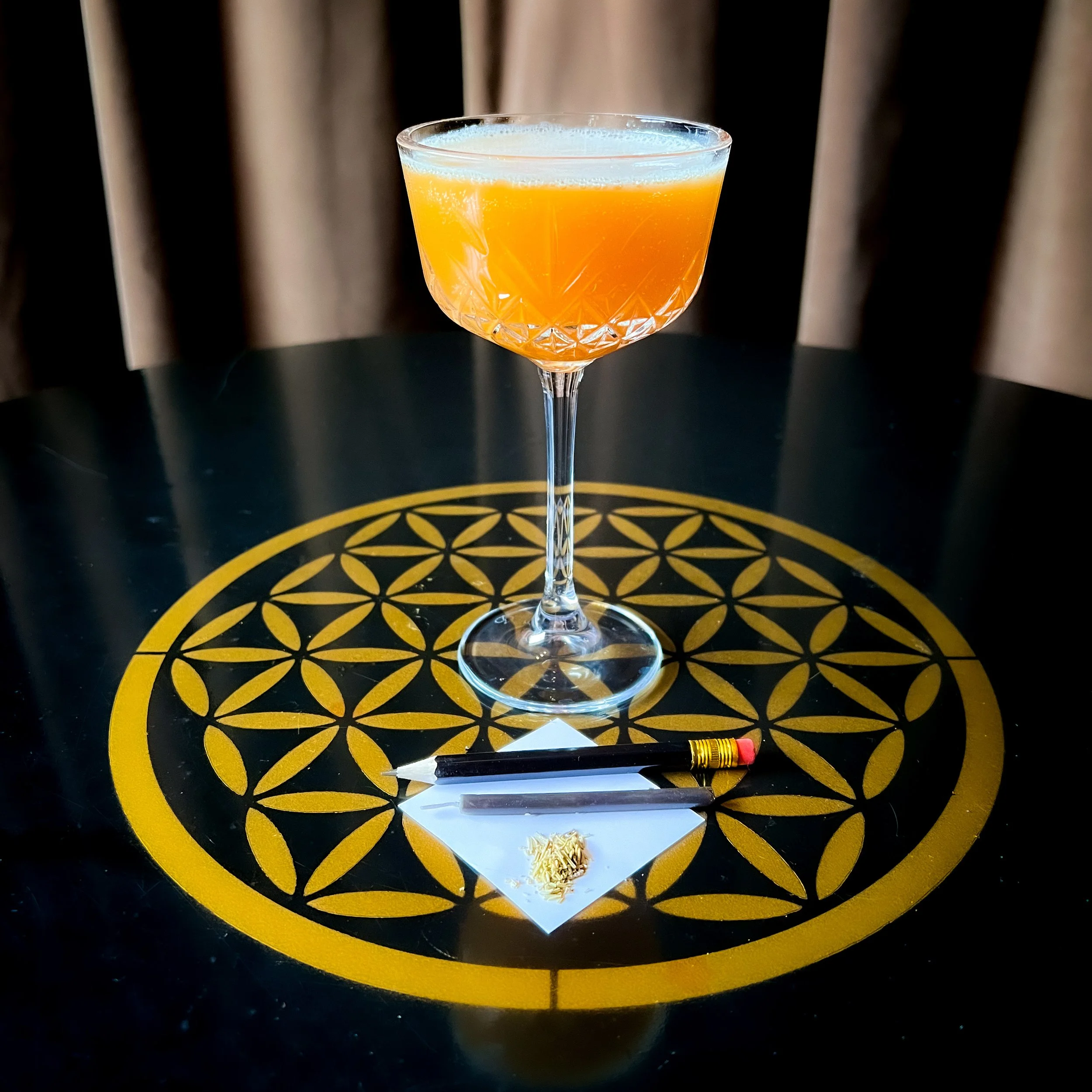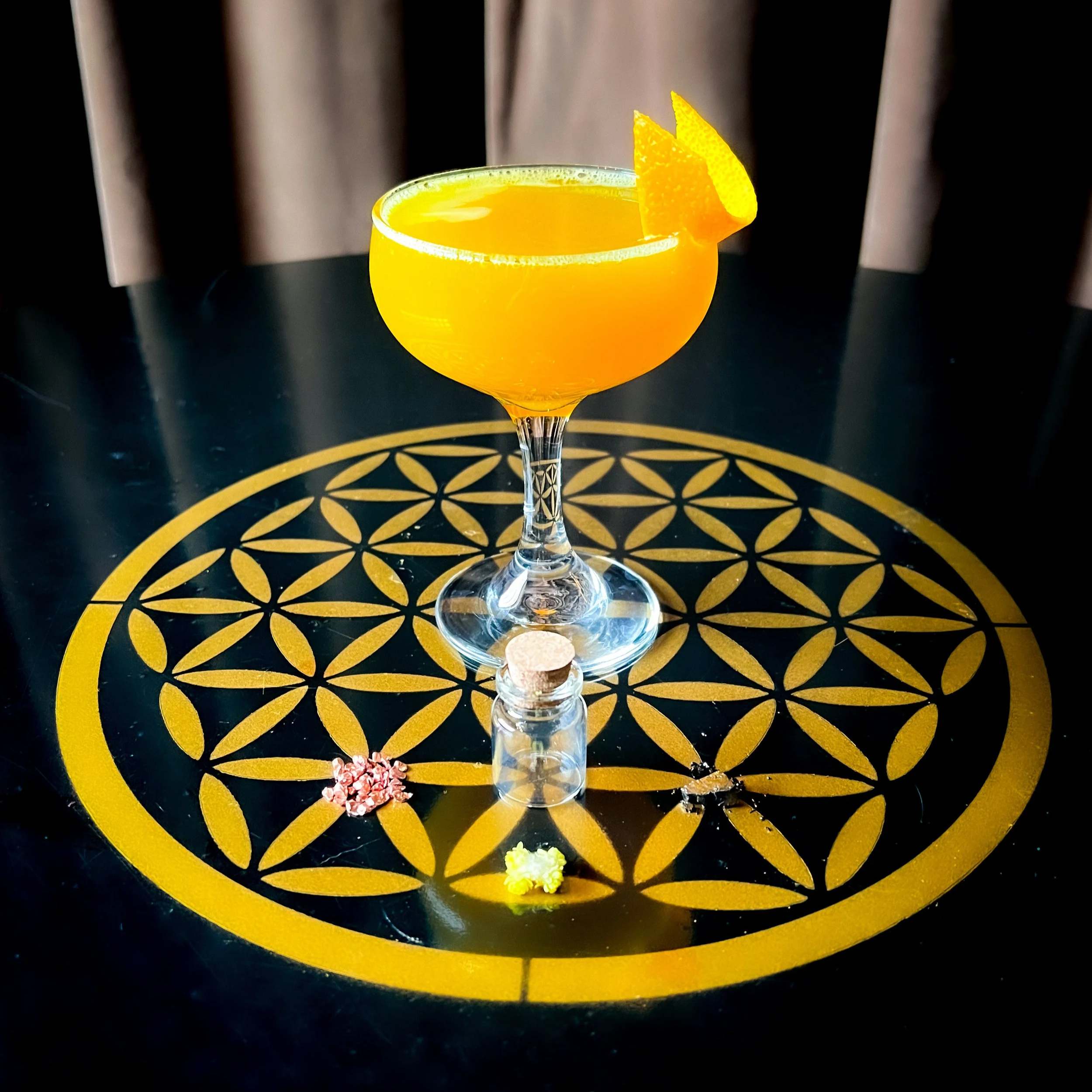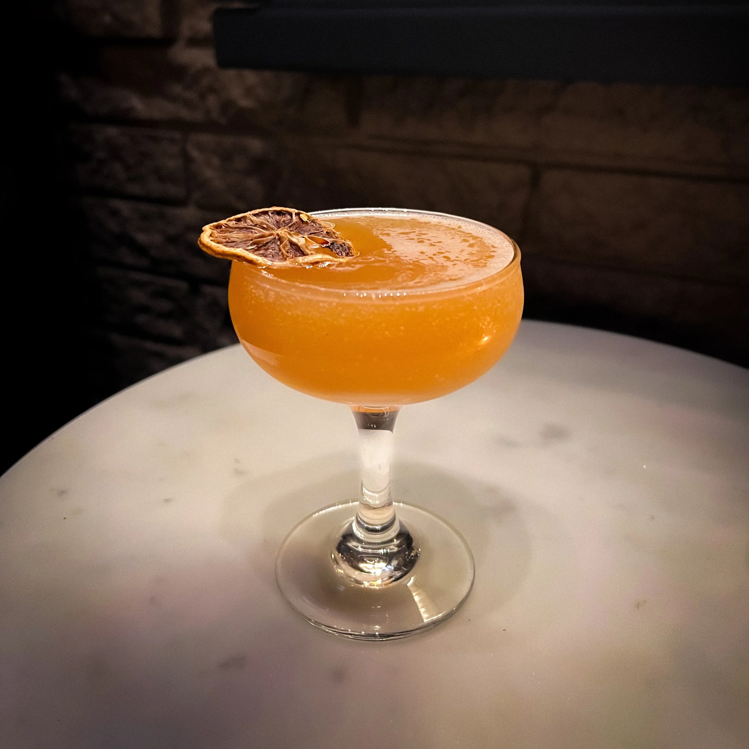 Old Forester 86 bourbon, turmeric infused Banhez mezcal, Amaro Montenegro, orange, shrub with schisandra berry, ginger and honey