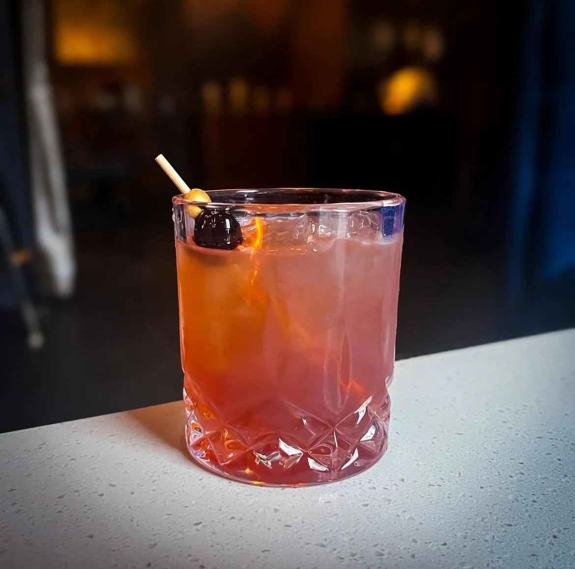 House made Honey Crisp and Cinnamon infused Old Forester 86 Bourbon, Michigan Dark Sweet Cherry Syrup, Harney & Sons Black Ice Tea