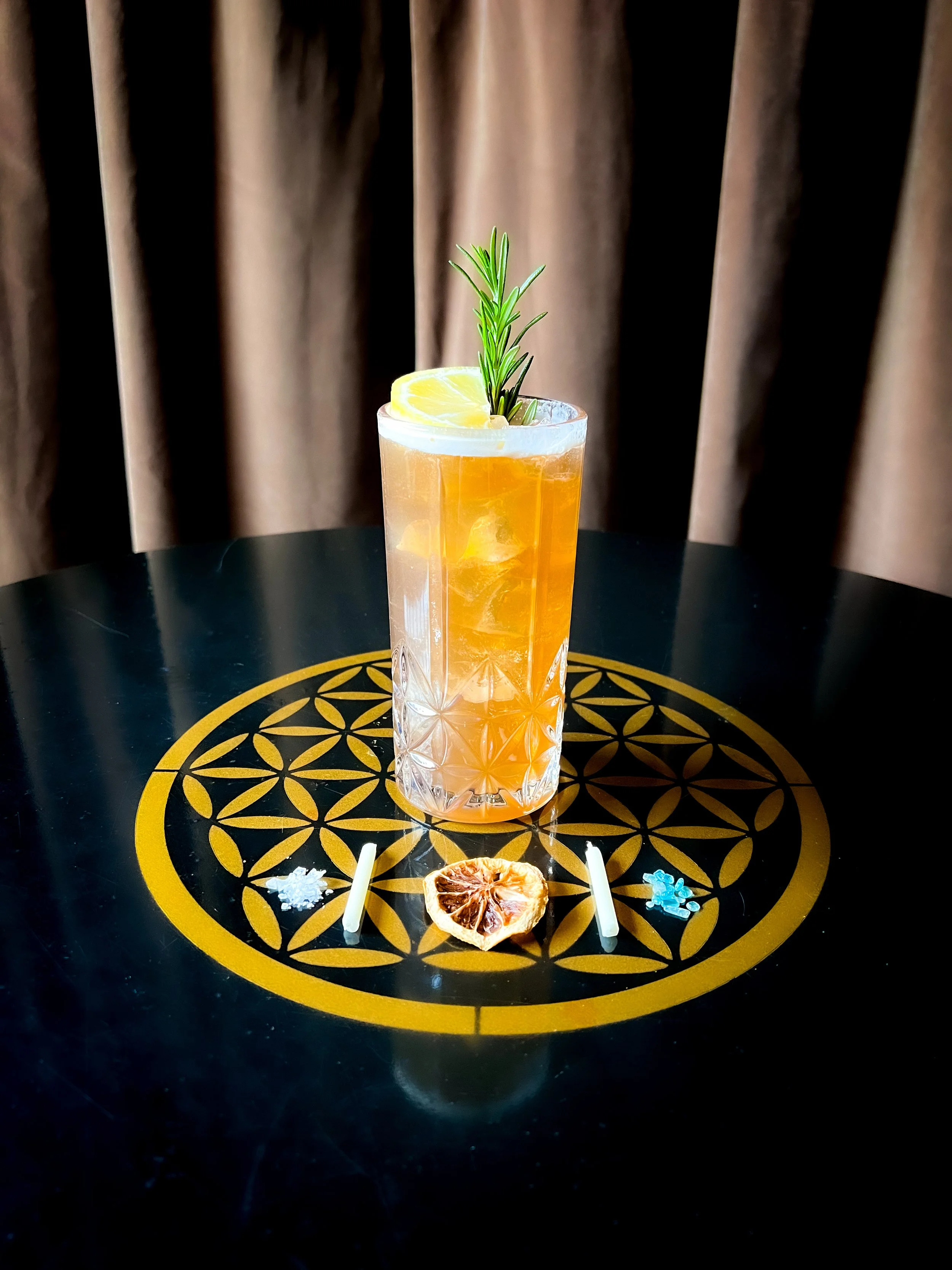 Tito’s vodka, Aperol, lemon and lemon balm tincture, soda made with rosemary, slippery elm, ginger, lemongrass, vervine, mullein, and agave