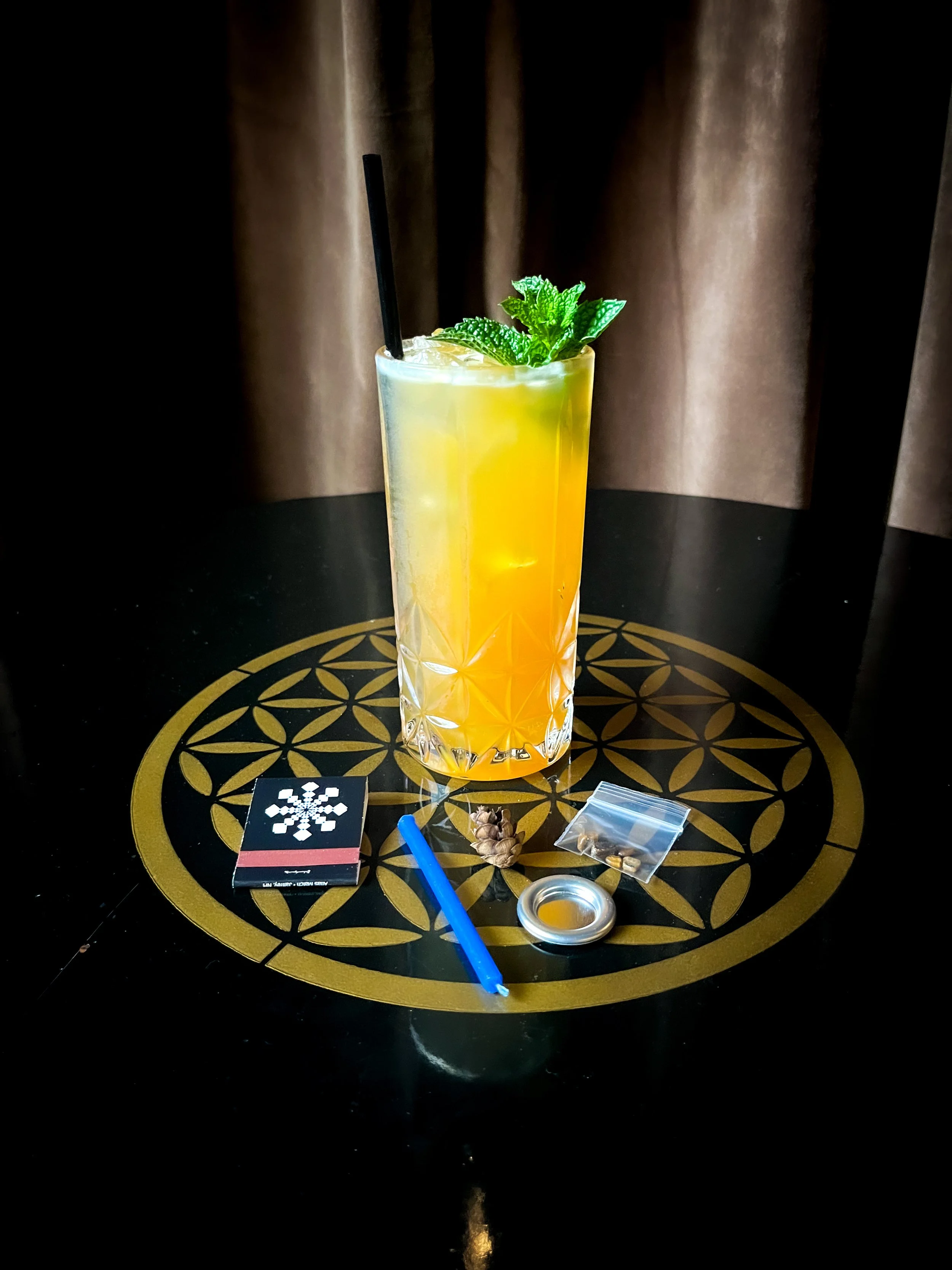 Old Forester 86 bourbon, acorn rosemary demerara syrup, lemon, egg white (vegan foam available), black walnut bitters, ube dust