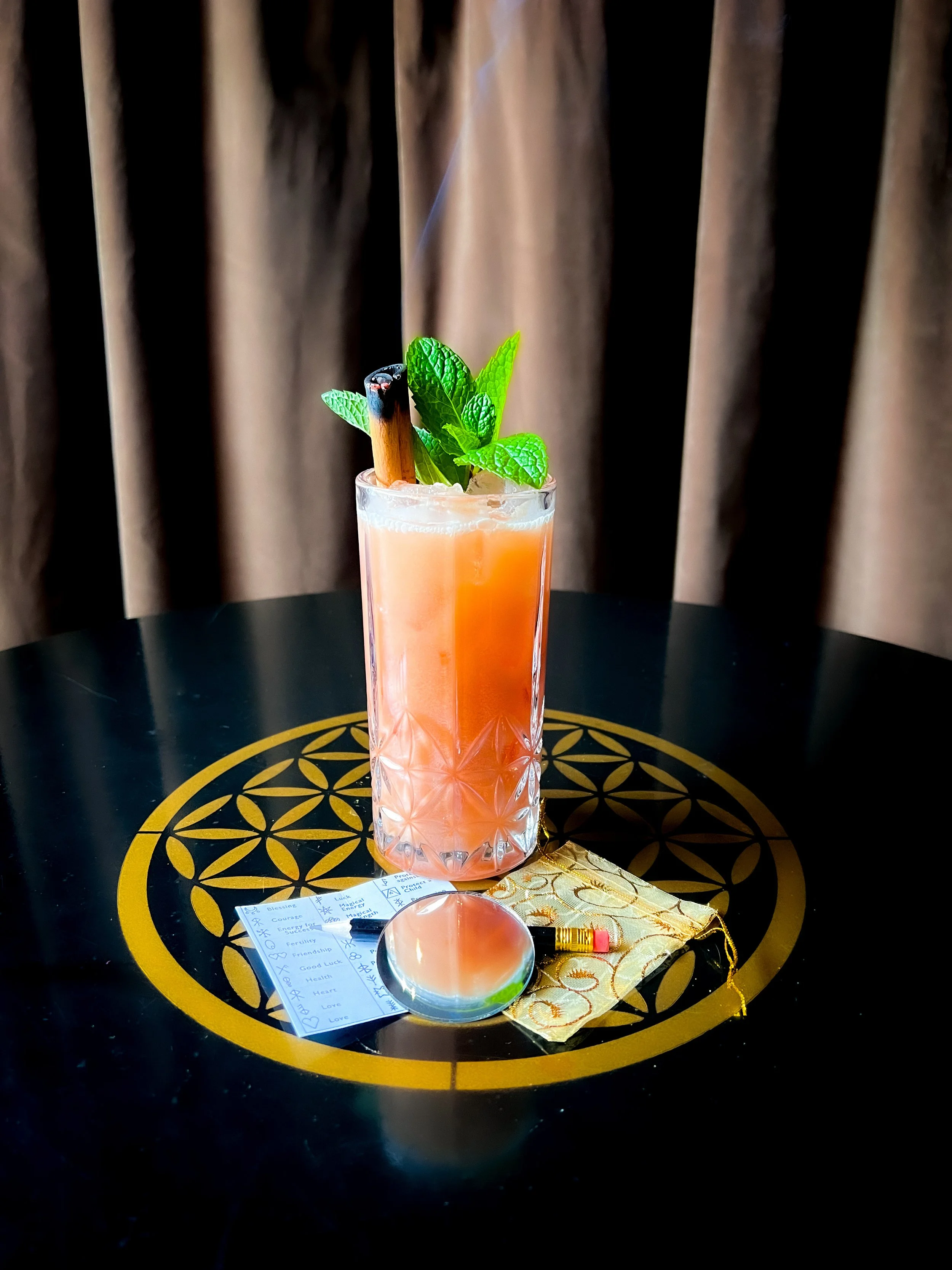 Old Forester 86 bourbon, turmeric infused Banhez mezcal, Amaro Montenegro, orange, shrub with schisandra berry, ginger and honey