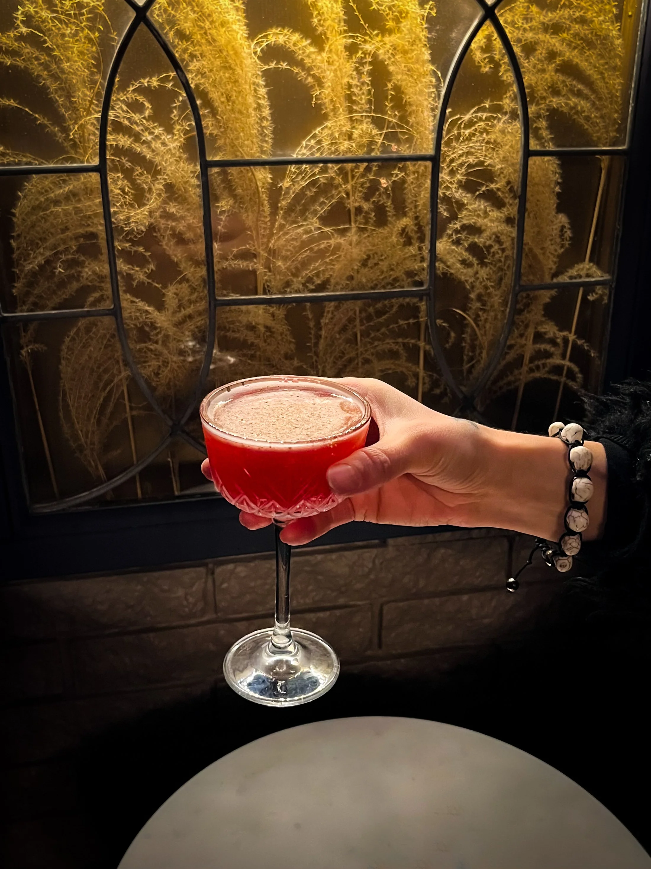 Dr Bird Rum, Banhez Mezcal, Campari, Lime, Cranberry, Pomegranate, Clove, Nutmeg